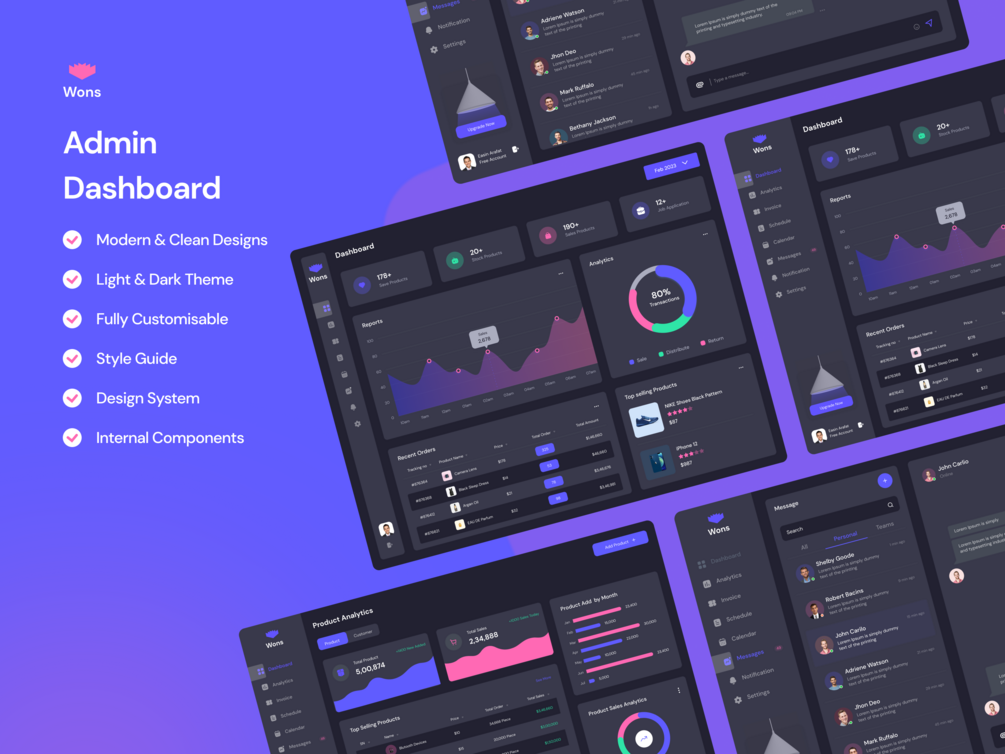 Wons Admin Dashboard UI Kit designed in Figma to speed up the designer work. This UI Kit Includes components such as buttons, forms, navigation bars, cards, tables, charts, and more. all components are fully customizable and easy to use. You can easily customize the look and feel of the components to match your design style.